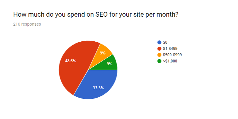 Of all the respondents, 48.6% reported that they spend $1-$499 per month on SEO for their own website. Only 9% said they spend $500-$999, and another 9% said they spend $1,000 or more. But what's interesting is who is reporting these big SEO budgets. Let's take a look at our most successful agencies.