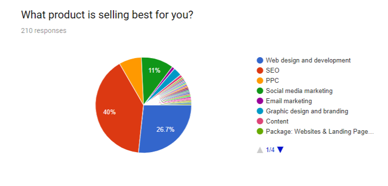 When it comes to best-selling products, SEO is the clear winner. A whole 40% of all agencies surveyed said SEO is their best-selling product. Web design and development came in second with 26.7% of agencies citing it as their best-selling product.