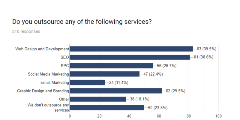 Many agencies have a hard time scaling, though quite a few are able to do so with the help of white label companies. In fact, of all the agencies surveyed, 39.5% outsource web design and development, and 38.6% outsource SEO. An additional 26.7% outsource PPC.