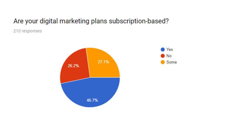 To ensure recurring work, 46.7% of all the agencies surveyed offer only subscription-based digital marketing plans; 27.1% offer some subscription-based plans and some a-la-carte plans.