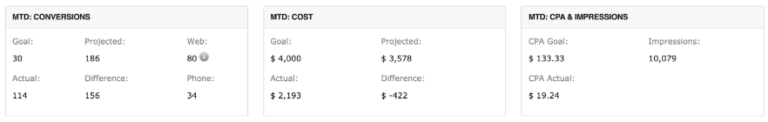 This PPC campaign for an Orlando area car dealership has been running only a short while, but the results are undoubtedly impressive. In this case, the reseller wanted to keep the cost per action under $150 ($130 was the goal). Our PPC analyst used their expertise to determine the best keyword bids — and a combination of core and branded campaign ads — to yield high conversions and low costs. In fact, the current cost per action for this campaign is $19.24. That translates to a major return on investment while minimizing initial spend. There’s still room to grow this early in the campaign and our analyst expects to continue this positive trajectory.