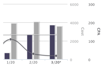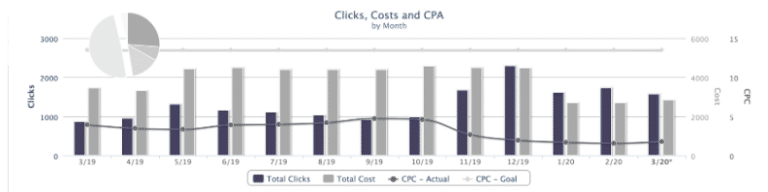 Although this campaign doesn’t look like it’s been as successful at first glance, context matters. This client owns a brand new luxury apartment building in the Seattle area. The client’s main goal? To eliminate unit vacancies. Our analyst carefully selected and monitored this campaign’s PPC ads over the past year — and their efforts paid off. Now that every apartment has been rented, the client has decreased their ad spending. As a result, their ad clicks have slowed. But that’s exactly what should happen as part of this strategy. And while the cost per action goal was around $13.50, our actual cost per action ended up being only $1.78. In the end, that’s a substantial number of impressions for the investment.