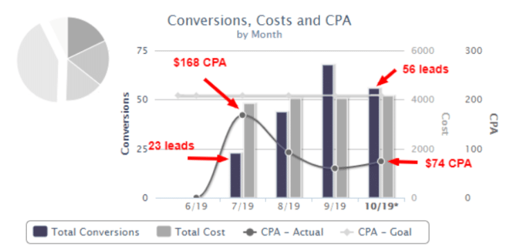 Here’s another apartment rental PPC campaign managed by our team. In this case, we measured phone calls and contact form fills to provide conversion reporting. As you can see, leads increased from just 23 in July 2019 to 56 leads in October. This campaign also experienced a 55% decrease in cost per lead (CPA). Lowering the cost of each lead is accomplished through diligent work on our side to improve the quality score of the campaign. In just three months, this campaign saw a tremendous amount of growth and was able to achieve its advertising goals.