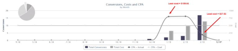 The beauty and personal care industry is booming, which means that the market is highly saturated. When you own a brick-and-mortar business in this sector, it makes sense to advertise with PPC in order to appear more prominently in local search results. In this case, a salon that offered eyelash extensions and other related services decided to venture into PPC ads in order to increase their conversion goal. From phone call and website form tracking, we know that the salon was receiving only two leads per month in January 2019. But by March 2019, the client generated 17 leads (a 750% increase!). Although the budget did increase 99.8% during the three-month period, their cost per lead actually dropped from $159.66 to $37.53, representing a 76.49% decrease in cost per lead. Clearly, this can be a viable solution for small, independently owned businesses that need to see immediate results.